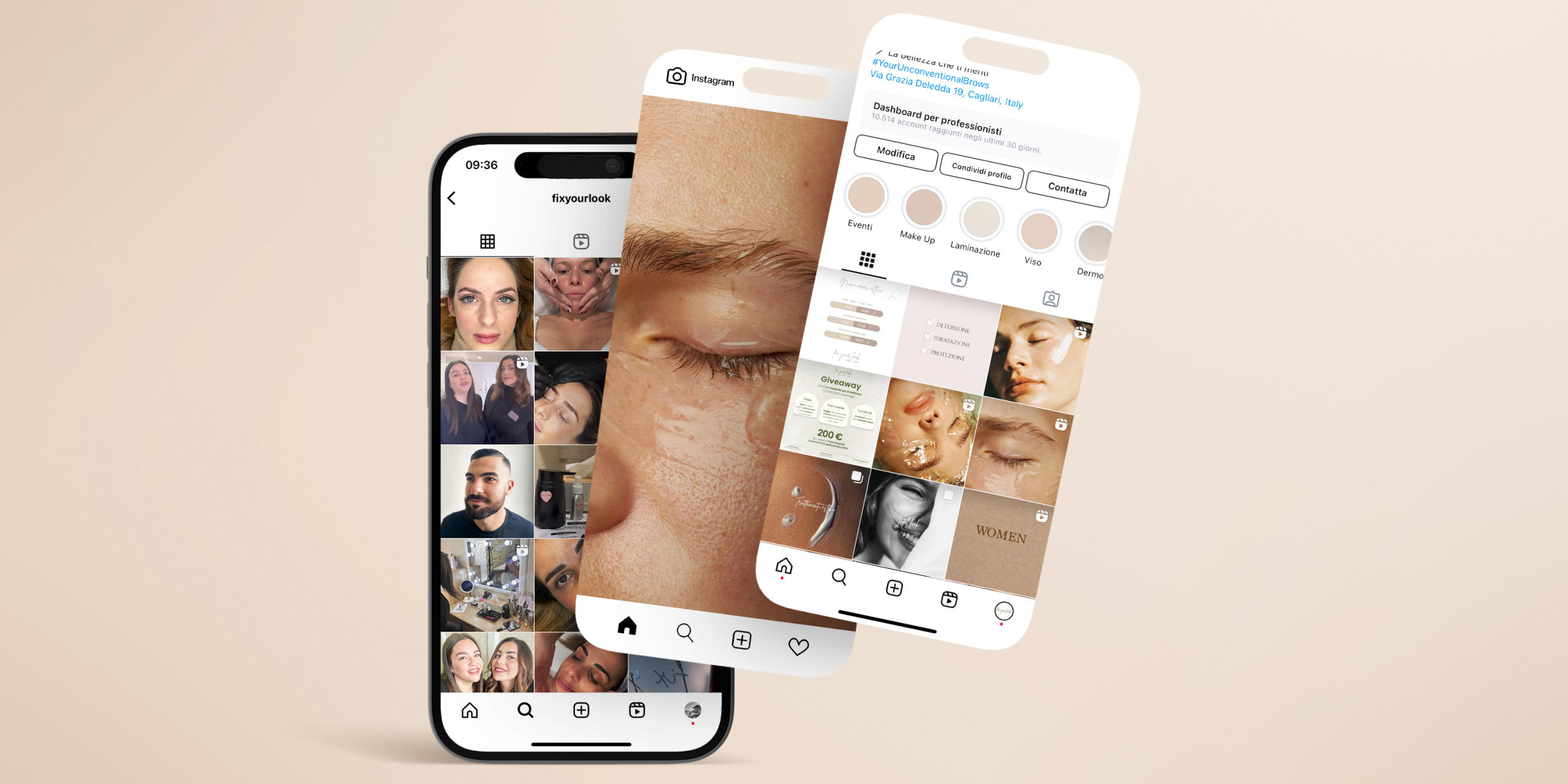 Abbiamo selezionato tonalità delicate e naturali che richiamano la bellezza della pelle sana e dei prodotti utilizzati nei trattamenti. Questa scelta cromatica non solo valorizza i risultati estetici, ma crea anche un’esperienza visiva piacevole e coerente per i visitatori del feed.
